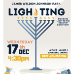 Food trucks and a #LiveAtLunch musical performance by Joe Watts every Wednesday at Charlie’s Café in James Weldon Johnson Park during lunchtime [11am – 2pm]. Check our social media for daily updates on our food truck line up and more! , ...Menorah Lighting4:30 pm - 4:30 pm