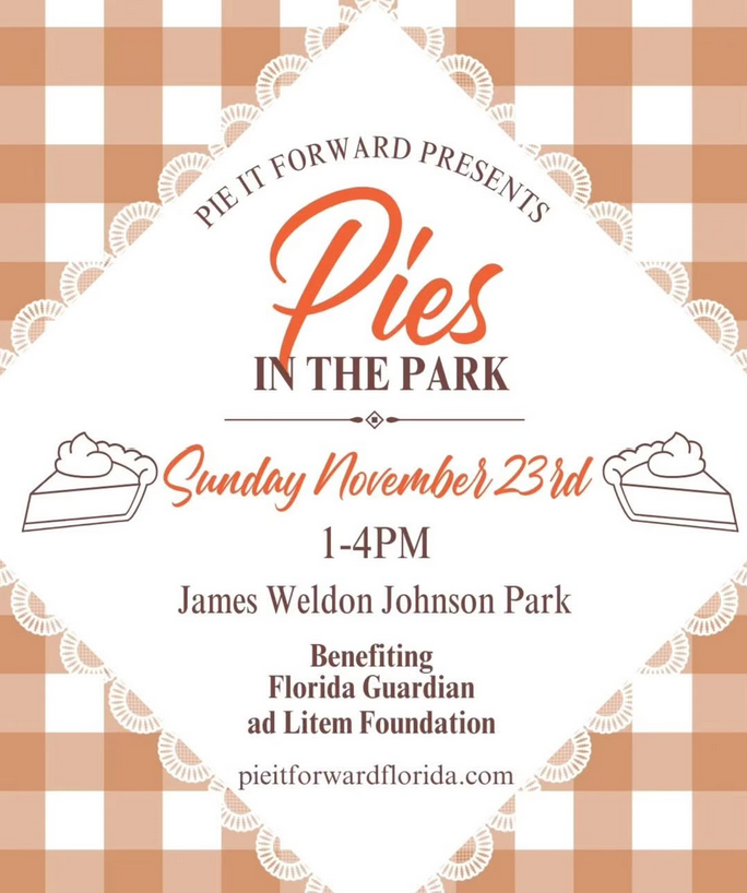 Pies in the Park a fall-inspired community dessert pop-up where pies, purpose, and play come together under the trees of downtown Jacksonville. This open-air event is part of the Pie It Forward Florida initiative, and 100% of ticket proceeds donated to the Florida Guardian ad Litem Program benefiting Circuit 4 to support children in Florida’s dependency system.