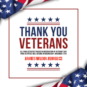 Happy Veteran’s Day to all who serve, have served, and have made the ultimate sacrifice. All gave some, some gave all, and we all give thanks for your heroism.   All Park activities are paused today in observance of Veteran’s Day. Activities will resume on Wednesday, November 12th.